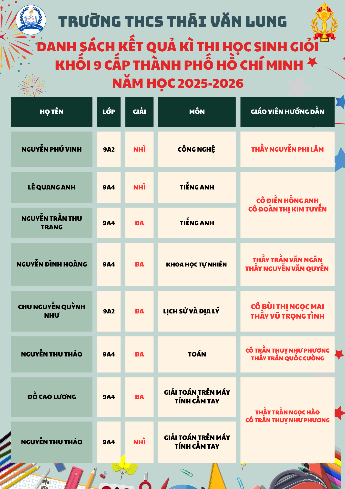 Nhà trường xin gửi lời chúc mừng nồng nhiệt đến các em học sinh đã xuất sắc đạt giải. Chúc các em tiếp tục phát huy năng lực, giữ vững niềm đam mê học tập và chinh phục những đỉnh cao mới trong tương lai!